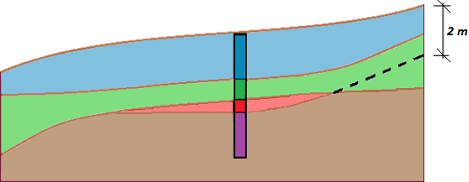 A continuación modificamos la perforación principal (siempre del lado derecho). Añadimos una capa roja entre las capas verdes y marrones. No ingresamos el espesor de esta capa, establecemos la ubicación de la interfaz inferior de capa como "no definido".