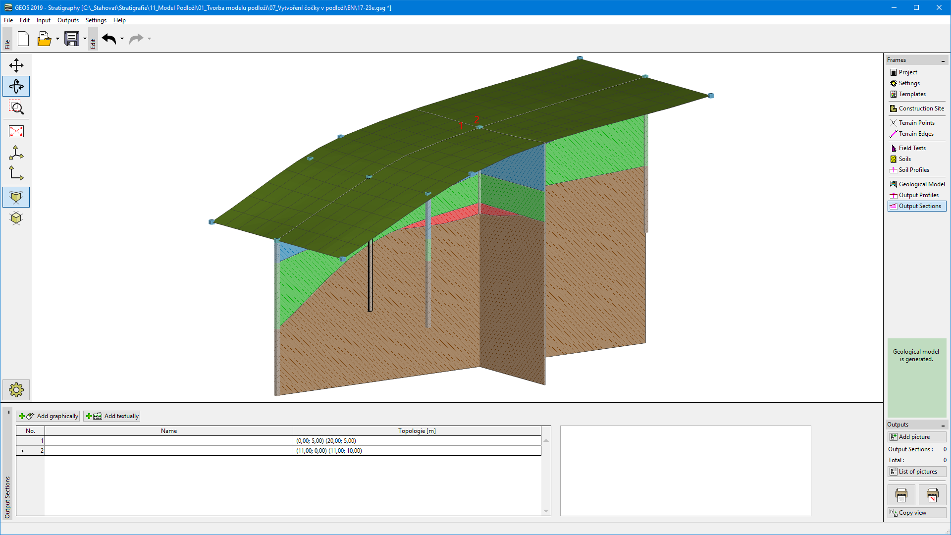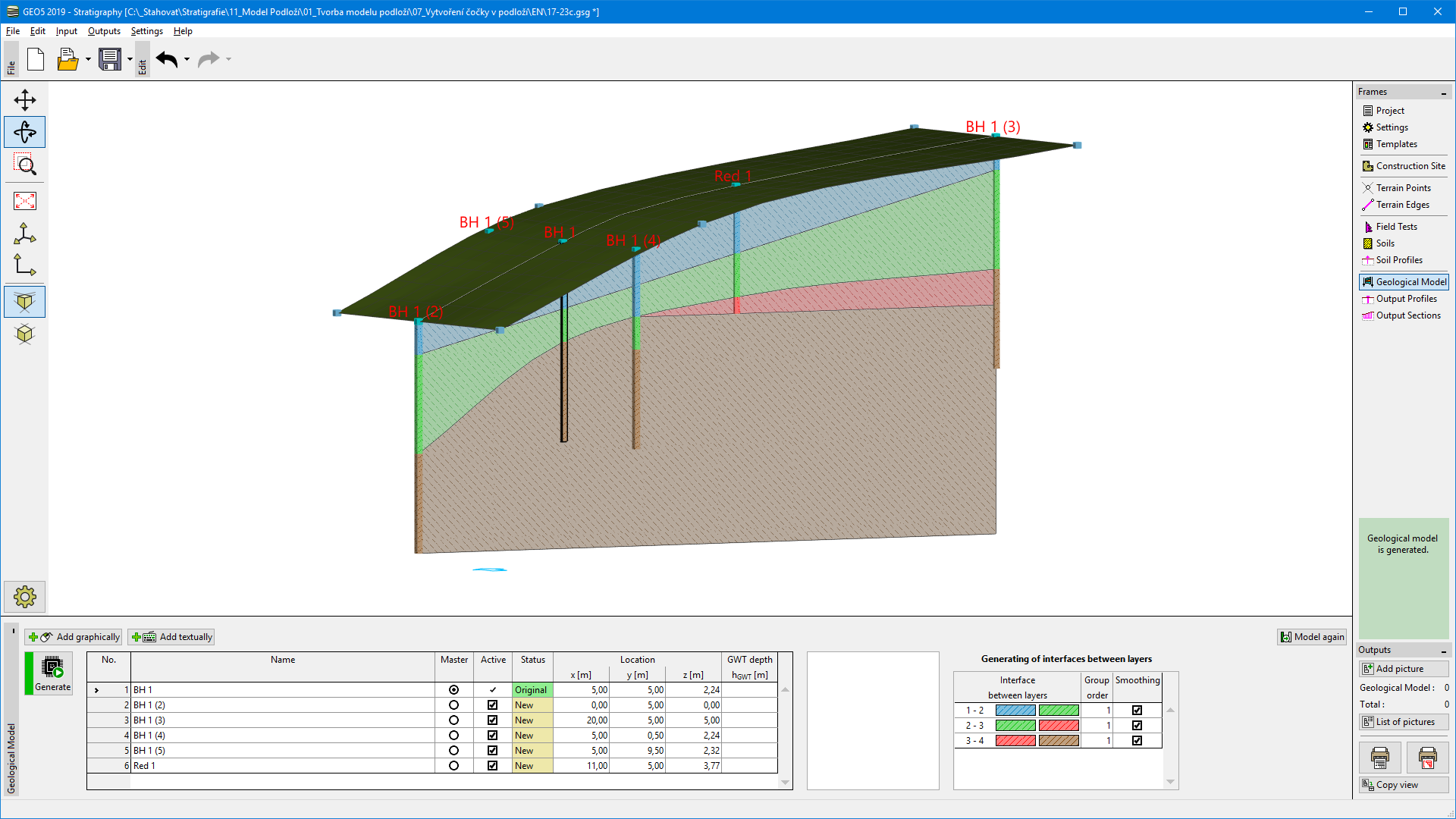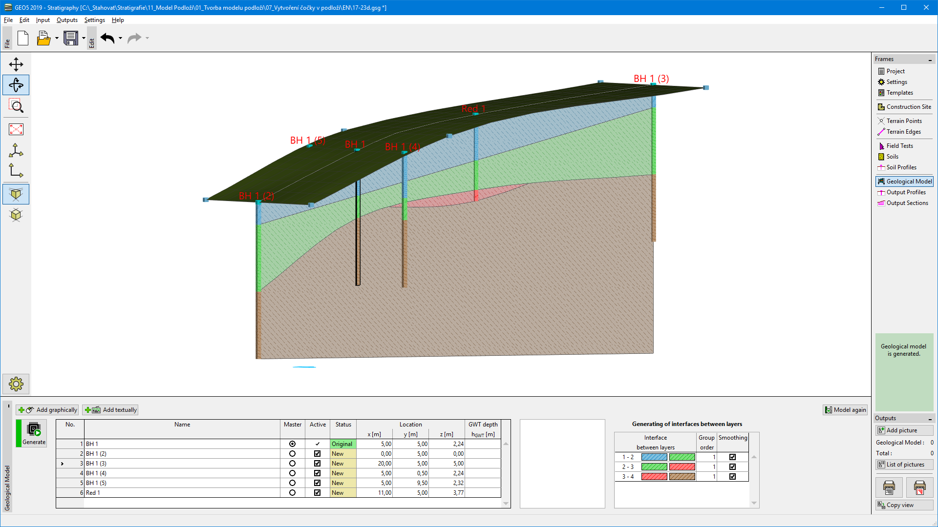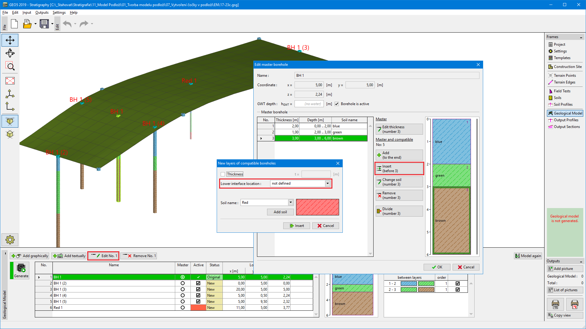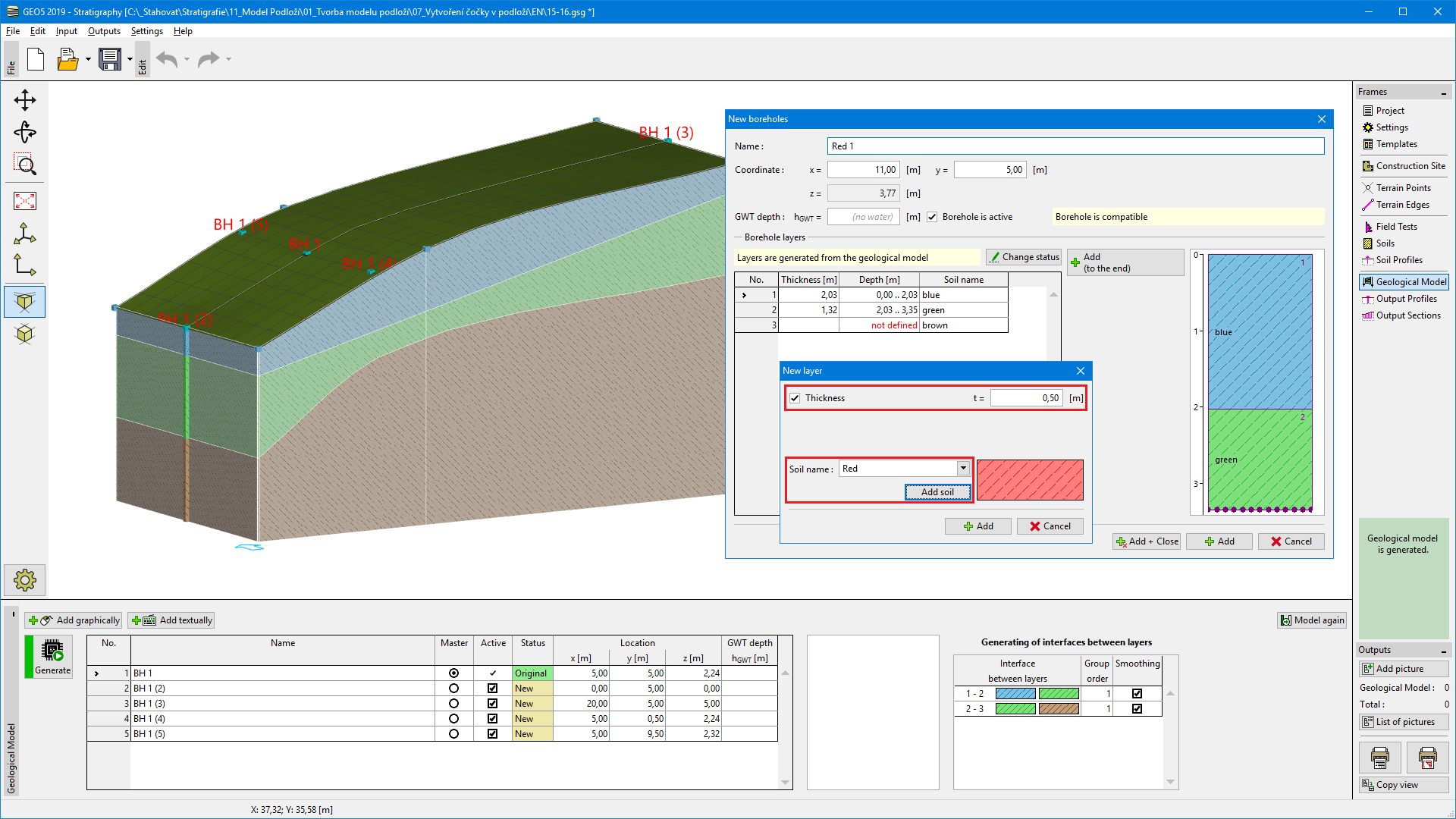 En el cuadro "Modelo geológico" definimos una nueva perforación (Roja 1) en el medio de la lente (coordenadas [11; 5]) e ingresamos una nueva capa (Roja, espesor de [0,5 m], usando el botón "Insertar (antes ded 3)".