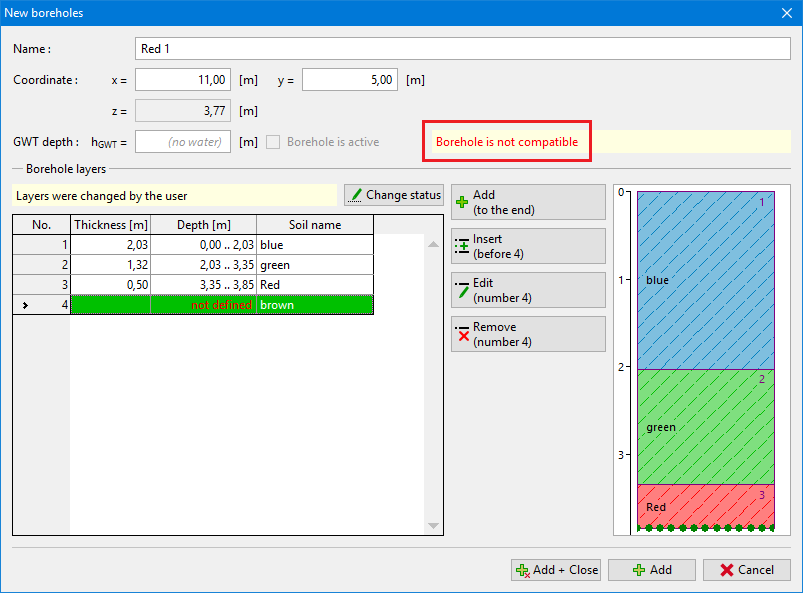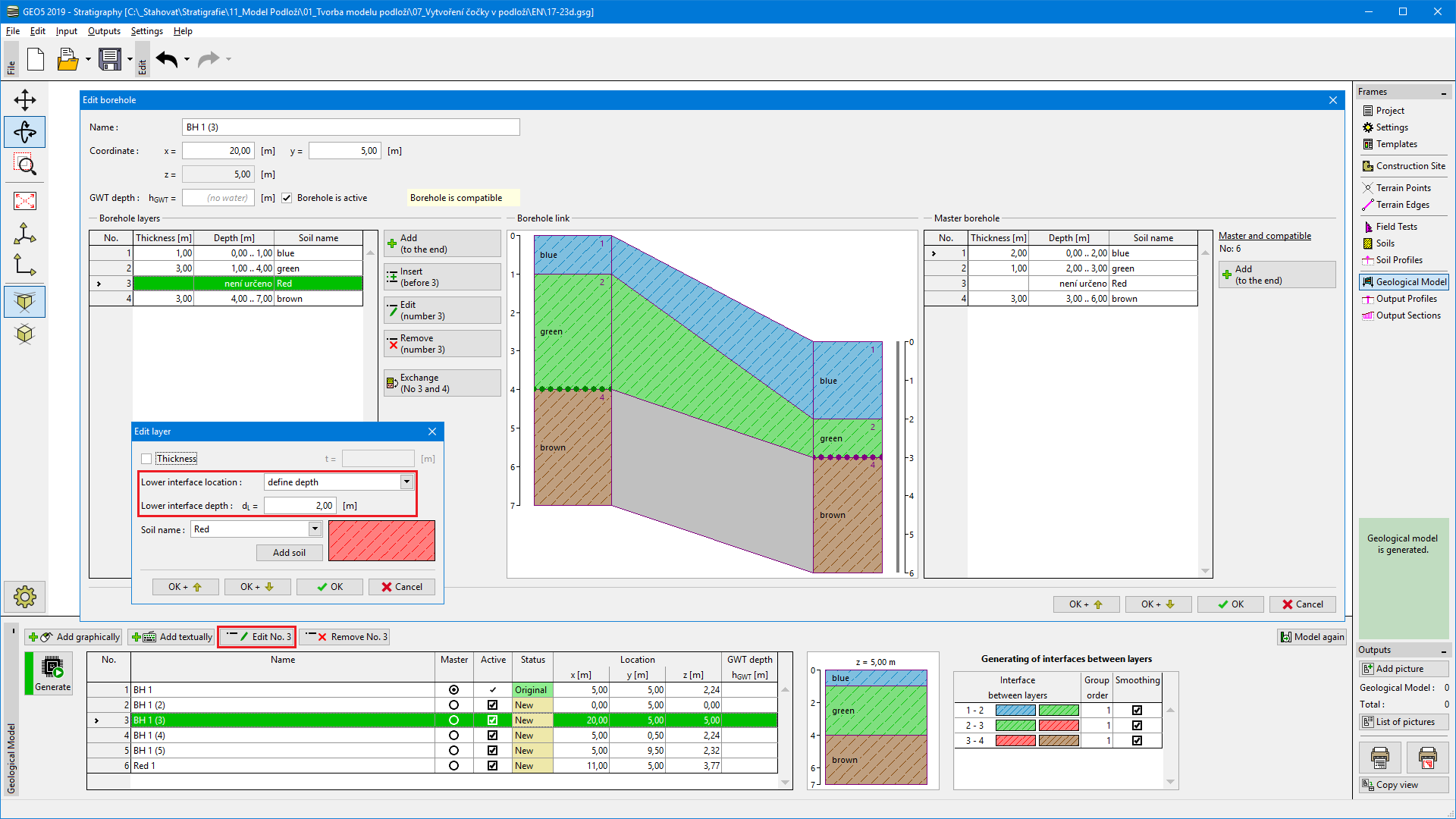 Ahora modificamos la capa de suelo roja en la perforación BH 1 (3). Cambiamos la ubicación de la interfaz inferior de "no definido" a "definir profundidad" e ingresamos la profundidad de la interfaz inferior de la capa roja [2 m]. (La profundidad se mide desde la parte superior de la perforación, el valor positivo es hacia abajo, el valor negativo es hacia arriba).