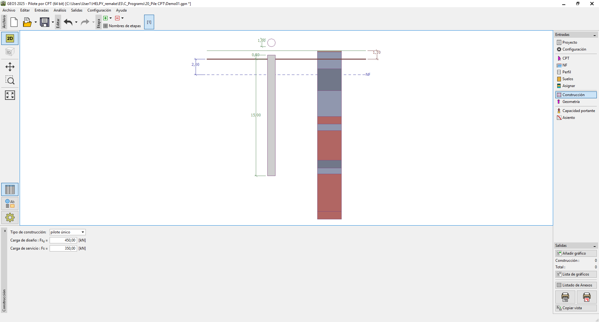 El cuadro "Estructura" sirve para seleccionar el tipo de estructura - pilote único o grupo de pilotes. El cuadro también sirve para introducir valores de sobrecarga - valores de diseño y valores estándar. El valor de diseño se utiliza para calcular la capacidad portante del pilote, mientras que el valor estándar se utiliza para calcular el asentamiento del pilote, cuando el estándar NEN es empleado (estado 1B y 2).
