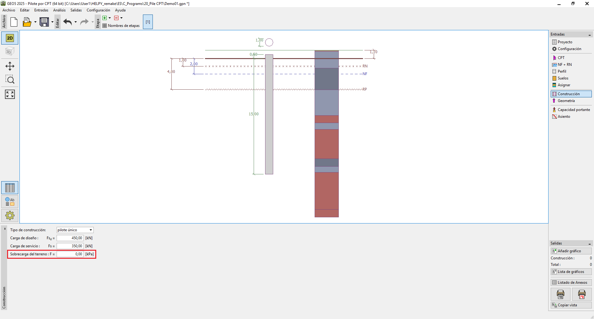 Si la opción "Considerar influencia del rozamiento negativo (RN)" es configurada en el "Configuración", entonces es también posible introducir la sobrecarga de superficie utilizando el cuadro "NF + RN" Napa freática + Rozamiento Negativo).