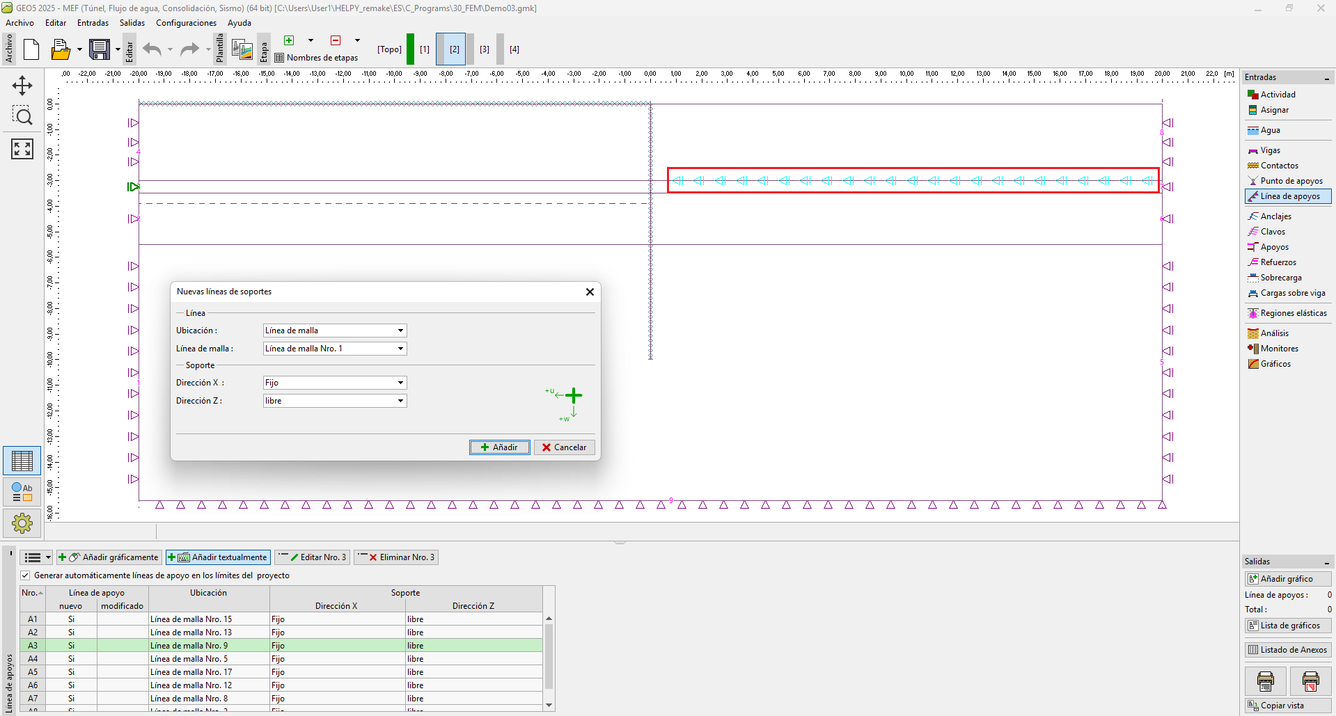 El cuadro "Líneas de apoyo" contiene una tabla con un listado de las líneas de apoyo. Para añadir una línea de apoyo se utiliza el cuadro de diálogo "Nueva línea de apoyo".