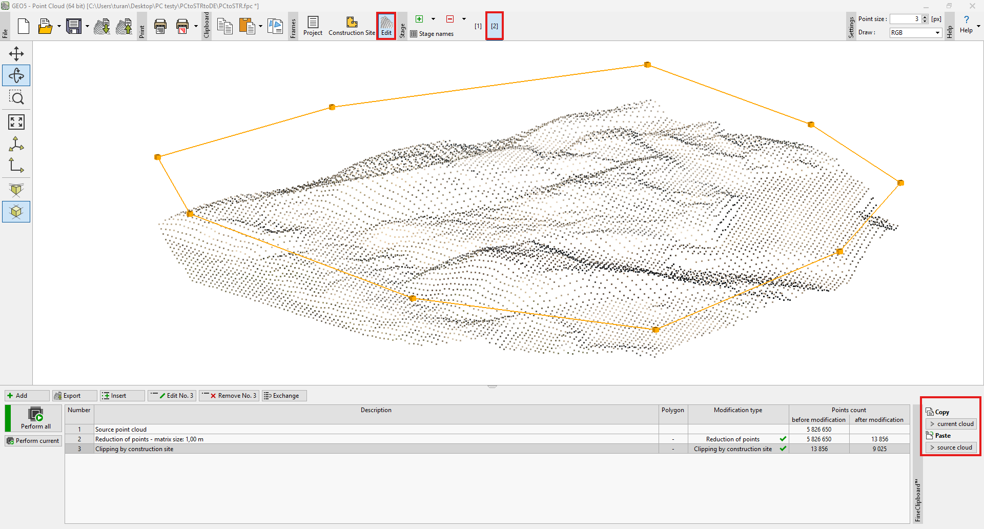 Para obtener ortofotomapas, puntos del terreno o un polígono del sitio de construcción, se puede utilizar el programa "Nube de Puntos" (si se compra). La transferencia solo es posible si se inicia el programa "Nube de Puntos" desde el programa "Estratigrafía" utilizando el botón "Nube de Puntos" en la barra de herramientas superior.