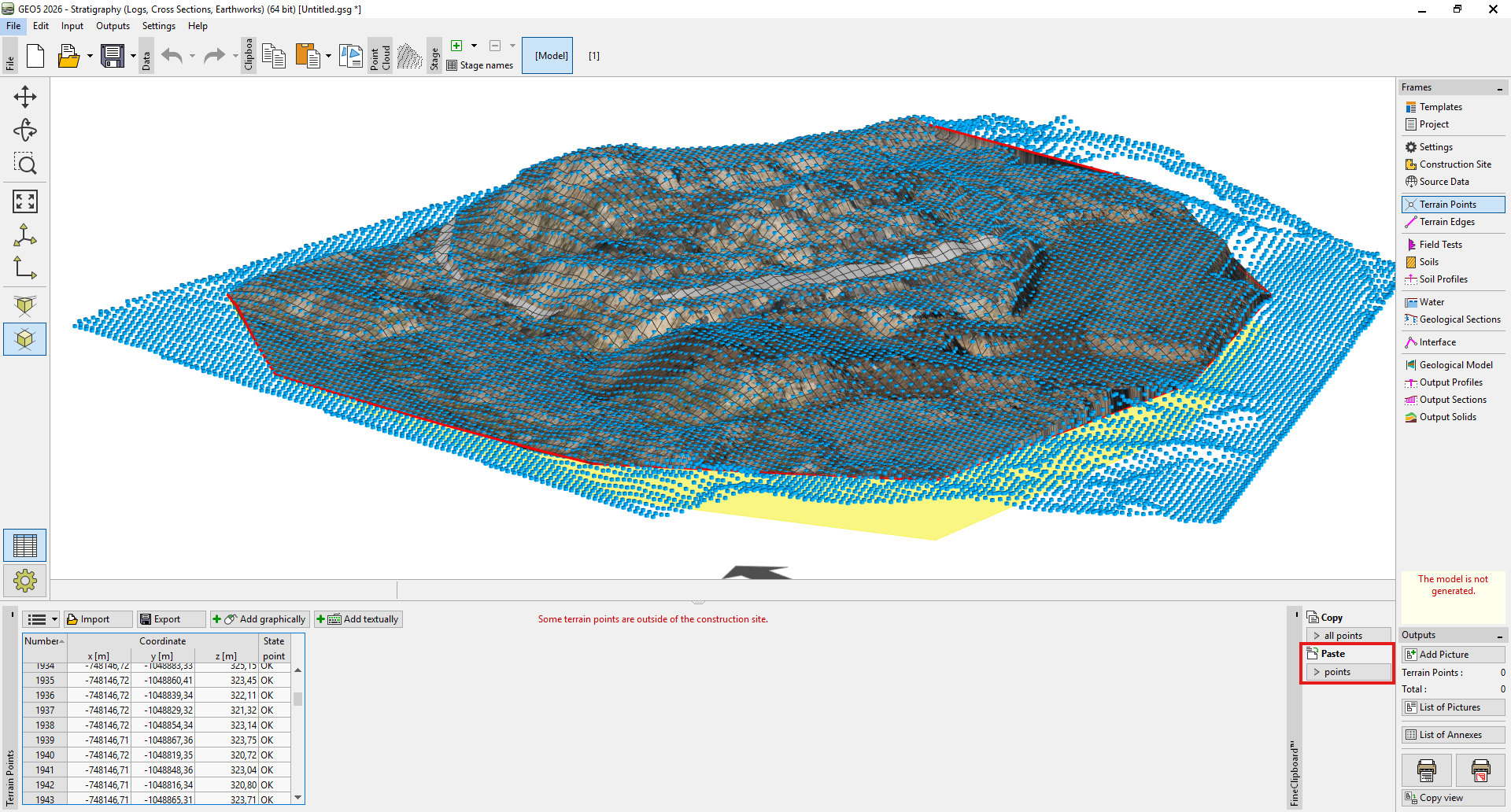 Los puntos de terreno se pueden agregar a los puntos existentes o se pueden reemplazar por completo. También se pueden importar en etapas de construcción posteriores para simular movimientos de tierra.
